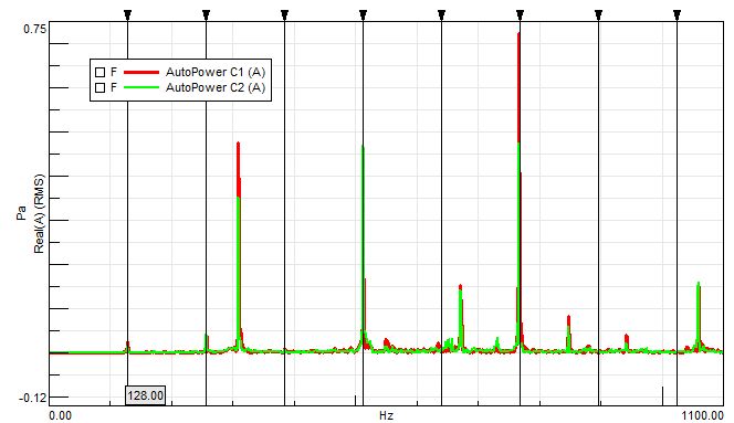Some more results below, linking the individual mode shapes to the corresponding frequency in the binaural audio recording. Notice that not all of the vibration patterns create a peak in the acoustic spectrum. This means the bell vibrates but is not generating any sound at this frequency.