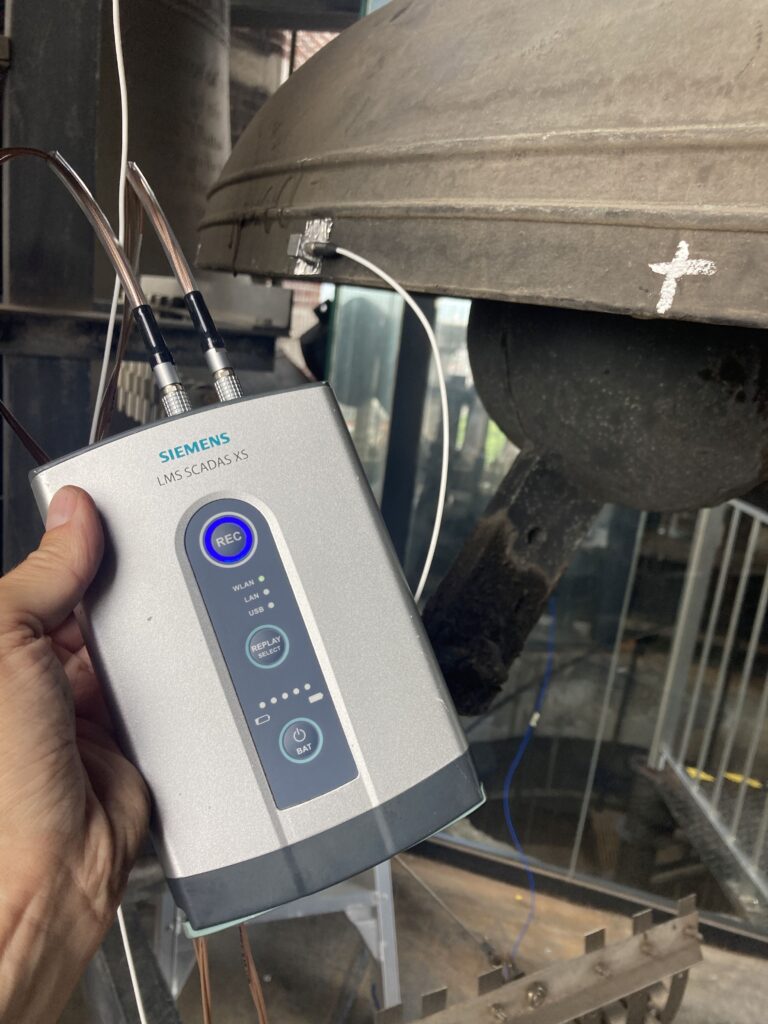 Climbing up the stairs to reach the bells is a challenge by its own. Needless to say I was happy that I did not have to carry any heavy measurement equipment with me. The pocket size Simcenter SCADAS XS is perfectly fit for this job. As a true sound and vibration analyzer, it can handle both the acoustic tests as well as the vibration tests. Once up there, we selected one of the bells: with a diameter of 1.6m and a weight of about 2.5 tons not even the biggest one!