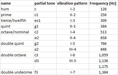 The frequency can also be described with its music annotation, where 128Hz corresponds to a “c”, the harmonics at 256Hz is “c1”, the double octave at 512Hz is “c2” etc. This gives the following table for the bell we measured.