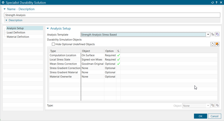 The analysis type is chosen in the second step, and the user can conduct strength, stress-life, or strain-life analysis. Preselection is also used here so that the method parameters are prepared.