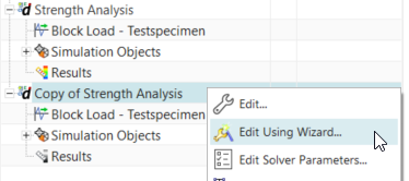 So, we can easily enhance a strength analysis to a fatigue analysis using the wizard. Simcenter not only remembers that a given solution was created by the wizard such that you can edit it with the wizard, but also cloned solutions inherit this property.