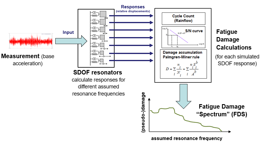 The FDS is a tool for assessing the fatigue damage potential linked to high cycle fatigue. Assuming that the resonant frequencies from vibrations signal are considered as SDOF (Single Degree of Freedom) systems, where we take frequency and Q-factor damping into account. The responses (relative displacements) are calculated from each of these SDOF systems. As the next step, we can put these responses on an SN curve and calculate damage for each response. Thanks to Palmgren-Miner damage accumulation rule, we can accumulate these damage values. FDS diagram gives us assumed resonance frequency on x-axis and pseudo damage on y-axis. This diagram gives great opportunity to (damage-wise) compare different vibration loads.