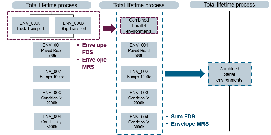 For example, if we want to count two different road conditions, we can sum FDS diagrams of the vibration loads. But imagine that the cars are shipped by truck or ship transport, and we also want to consider this impact. Then, we can envelope FDS or MRS diagrams to consider the worst-case condition for each frequency levels.