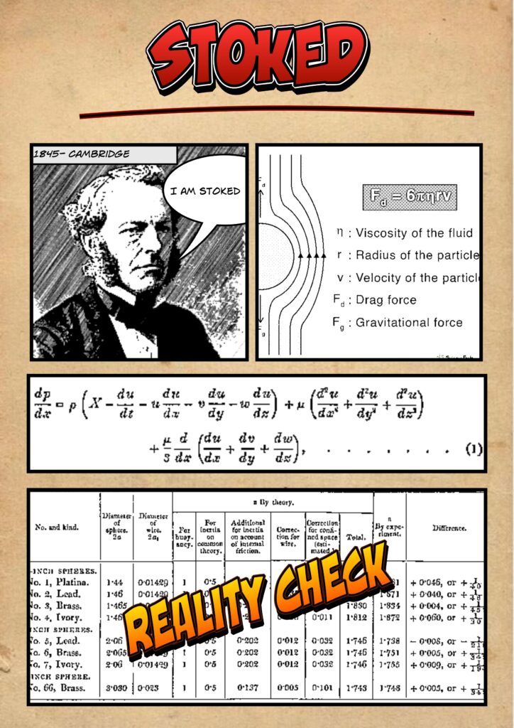 In 1845 he published his work on the friction of fluids in motion and the equilibrium and motion of elastic solids. It is this work where the Navier-Stokes equation sees the day of light for a fourth time. The second major contribution follows five years later with Stokes work on the effects of the internal friction of fluids on the motion of spheres, disks and cylinders. In rigorous mathematical fashion, he managed to start from his generalized equation, boil it down to cases that he could handle analytically and compare his theoretic results to numerous existing experiments on pendulums with oscillating spheres and cylinders of all sizes in all sorts of fluids. All this without assuming ideal fluids, i.e. considering a thing he labels the index of friction.