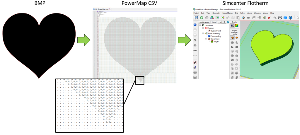 This csv file, although exportable from HyperLynx PI, can be defined using other data sources. For example, a simple VBA script (installed with Simcenter Flotherm) can convert a BMP image file into the corresponding PowerMap csv file. With Valentine’s day upon us once again, I thought I’d use a love heart to show the approach: