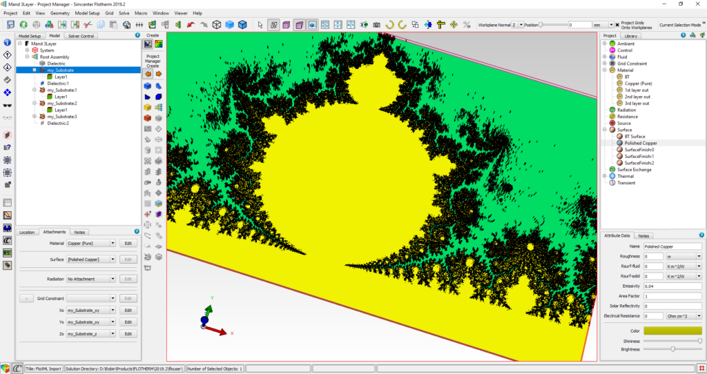 Once in Simcenter Flotherm it can be solved in the usual way. In this example a constant power (6W) is set in the PowerMap, a material assigned to it (385 W/mK) and a solid object in which it sits (2 W/mK) and peripheral heat transfer coefficients (1000 W/m2K) defined on the computation domain boundary to allow the heat to leave. The Power(Map) of Love indeed! (Not what Jennifer Rush intended, I’m sure 🙂 )