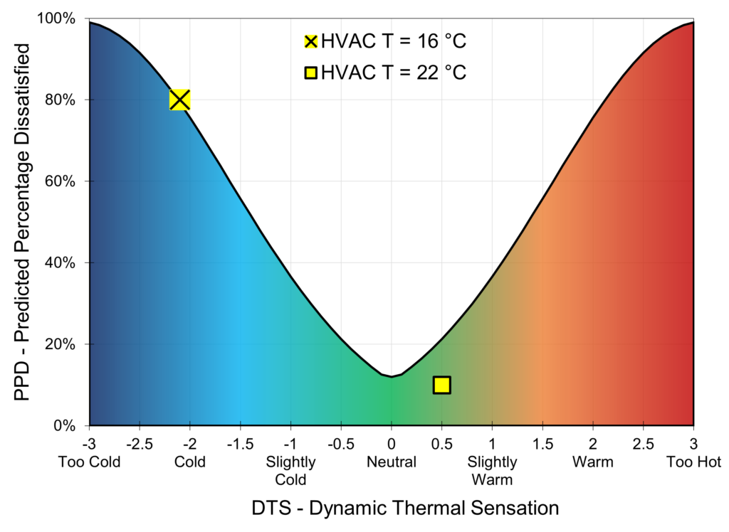 These models (DTS, PPD and EHT) take as input the solutions provided by the Fiala heat and thermoregulation model and compute the comfort indexes. DTS is a dimensionless number that follows the 7-point scale proposed by the ASHRAE standards. A negative DTS (-3.0 to -1.0) indicates that the manikin is feeling cold, and vice versa if positive. A value close to zero indicates that the passenger feels comfortable. The PPD is a statistical index and provides an estimate of the percentage of people that would feel dissatisfied under the given condition. Also in this case, the closer to 0%, the higher chances that the passenger(s) are feeling comfortable.
