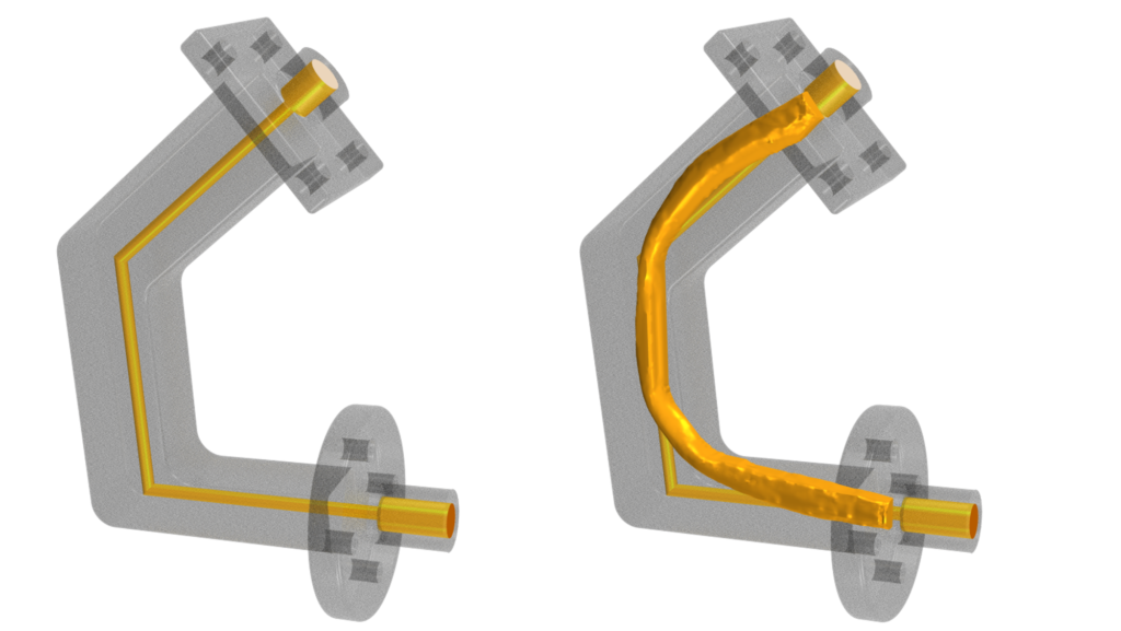 So, we took it to the test with a component of a simple fuel injector for an aircraft engine. Here we are interested in a lightweight and sleek design. It should not contain too much fuel which might cause issues with entrapped gas. And it should have an improved performance in terms of more steady flow and less power consumption for the pump. Traditional shape optimization methods cannot take advantage of the full envelop. They really only explore a vast design space as they are restricted by the original shape and the parameterization itself. In this case we have quite a large envelop to work with. This allows the new design to achieve amazing performance improvement, as the video below shows.