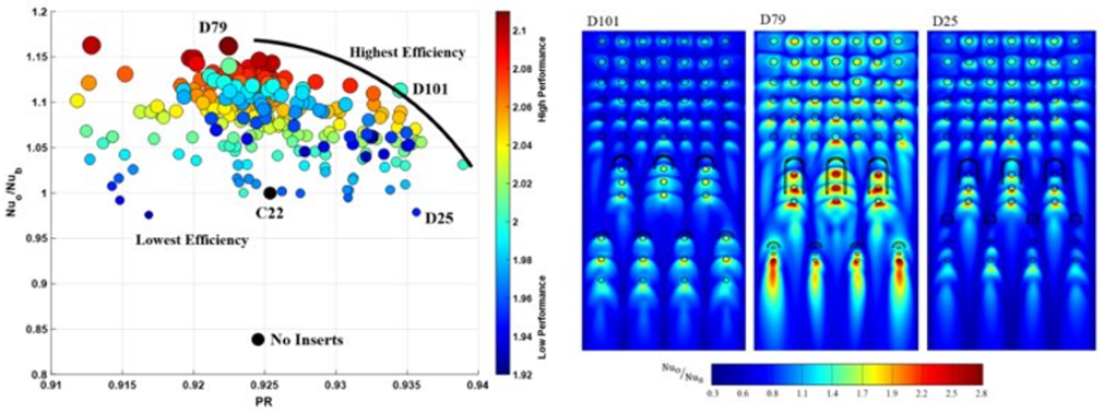 Pictured above, we can see this in action for a large cooling channel which is curved and shaped in a manner that is similar to a gas turbine blade leading edge. This channel has an array of impinging jets located over the surface for the sake of providing significant cooling, just like in field operation. Leveraging CFD and design exploration, the authors manipulate not only the jet size and array pattern, but also the shape and position of obstacles located throughout the cooled surface in order to break-up the flow structures and provide augmented heat transfer rates (cooling). While generating the complex configurations for optimal cooling, such is done with care to minimize the resulting pressure drop required to pump the cooling jets into the channel.