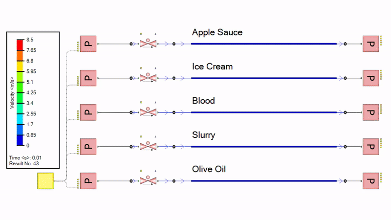 An overview of the model used to simulate the system is shown below. Each system is identical and at the start of the simulation all of the pressure sources are set to 2 bar. The inlet is controlled and linearly increases to 4 bar over 10 seconds. While we have simulated apple sauce and ice cream I have also thrown in some other fluids just for fun.