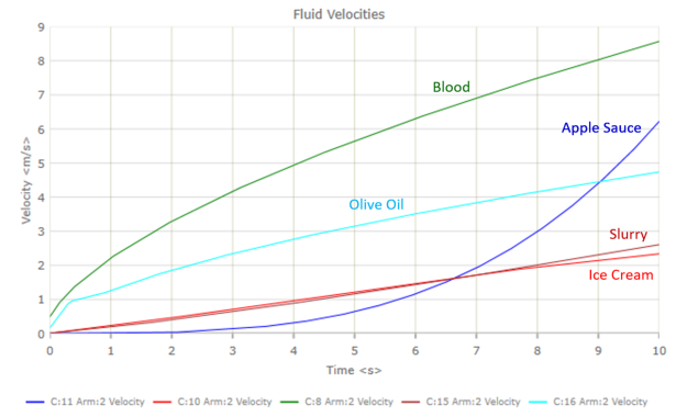 This graph illustrates how all of the fluids have certain resistance to the flow initially and then at different points they start to slip and flow. Apple Sauce (blue) shows this behaviour best as it resists the flow for the first couple of seconds and then suddenly starts to flow quickly, with a final velocity greater than the olive oil, slurry and ice cream. This means that if the pressure difference was maintained relatively low then ice cream would flow faster than apple sauce and win. At higher pressure differences apple sauce would win.