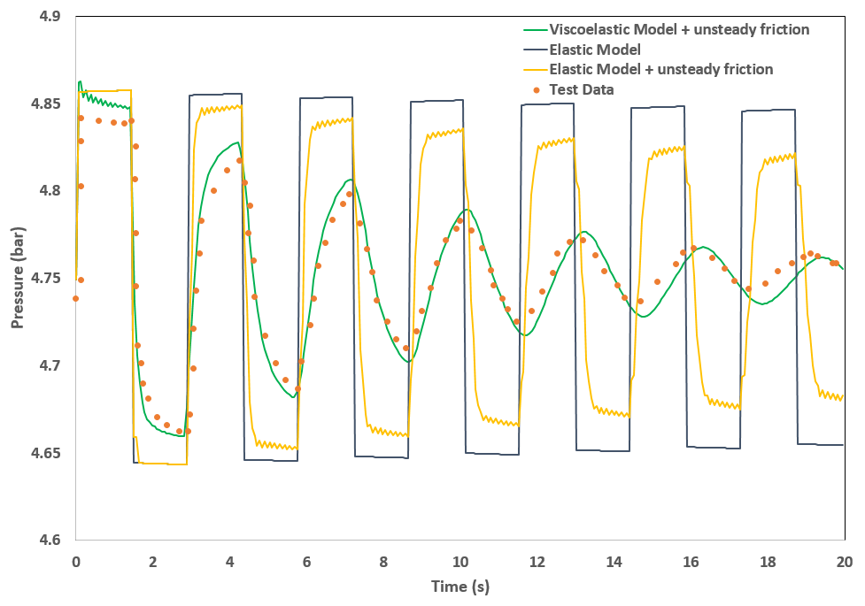Polymer pipes are getting more and more common in different industries. These pipes exhibit a different behaviors during surge events to those made of steel or brass. The pipe wall indeed has a non-linear response to pressure surge: an immediate elastic response is followed by a retarded viscous response. Simcenter Flomaster 2019.3 introduces a new option in the pipe component to account for visco-elastic behavior. In the figure below it can be noted the different behaviors between typical steel pipes in yellow and polymer pipes in green. It can also be appreciated how the results obtained with the new visco-elastic modelling capability are in good agreement with published literature (Covas, S. M. 2004. The dynamic effect of pipe-wall viscoelasticity in hydraulic transients. Part I—experimental analysis and creep characterization. Journal of Hydraulic Research Vol. 42, No. 5, 516-530.)