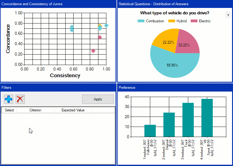 Last but not least, the highly awaited result filtering based on jury questions is finally here. Why would you do it? Narrowing down the answers based on the statistical questions allows you to quickly validate trends based on juror location, age or experience with your product. Example below shows the jury test results in function of the car type driven by the jurors.